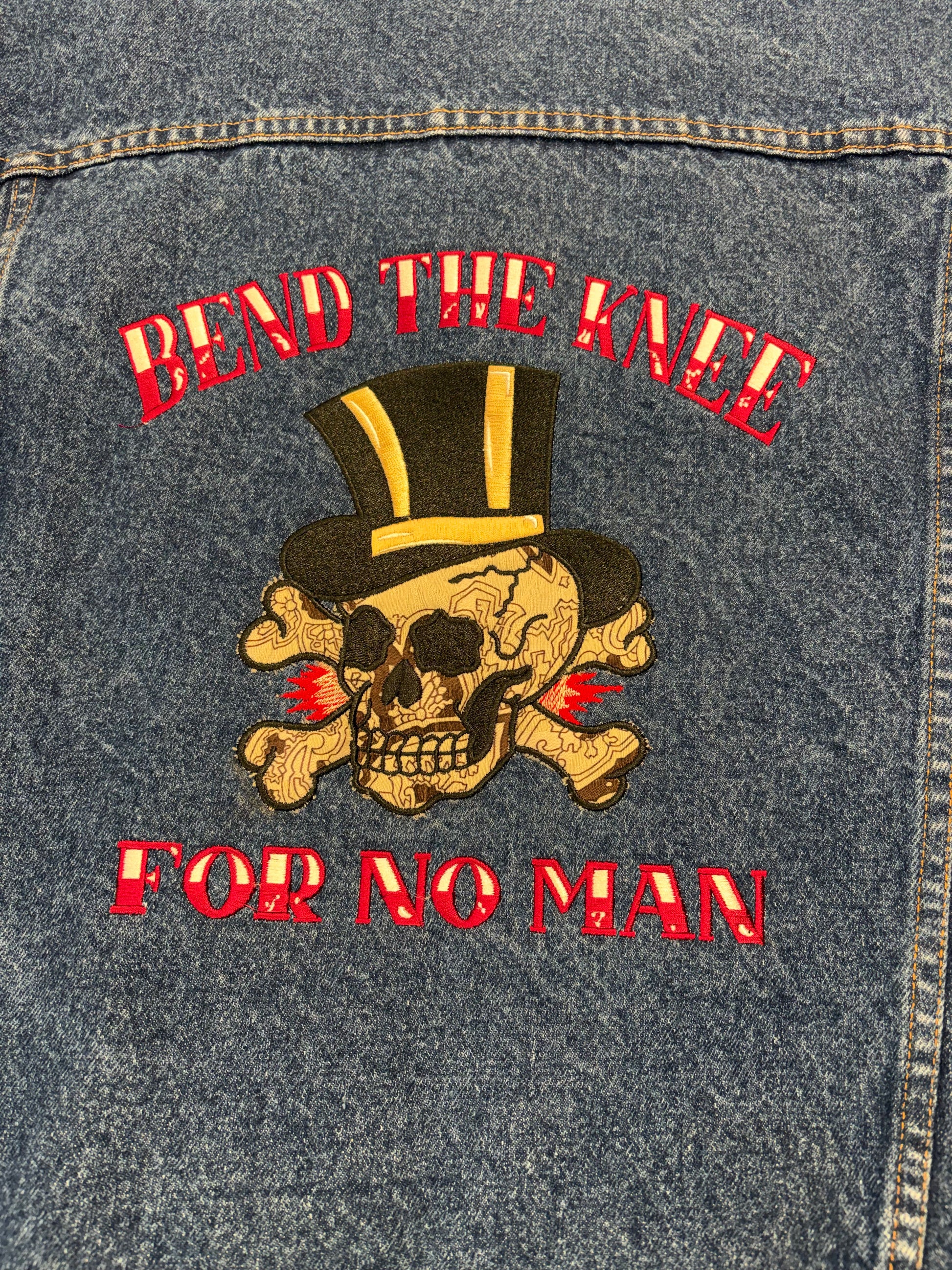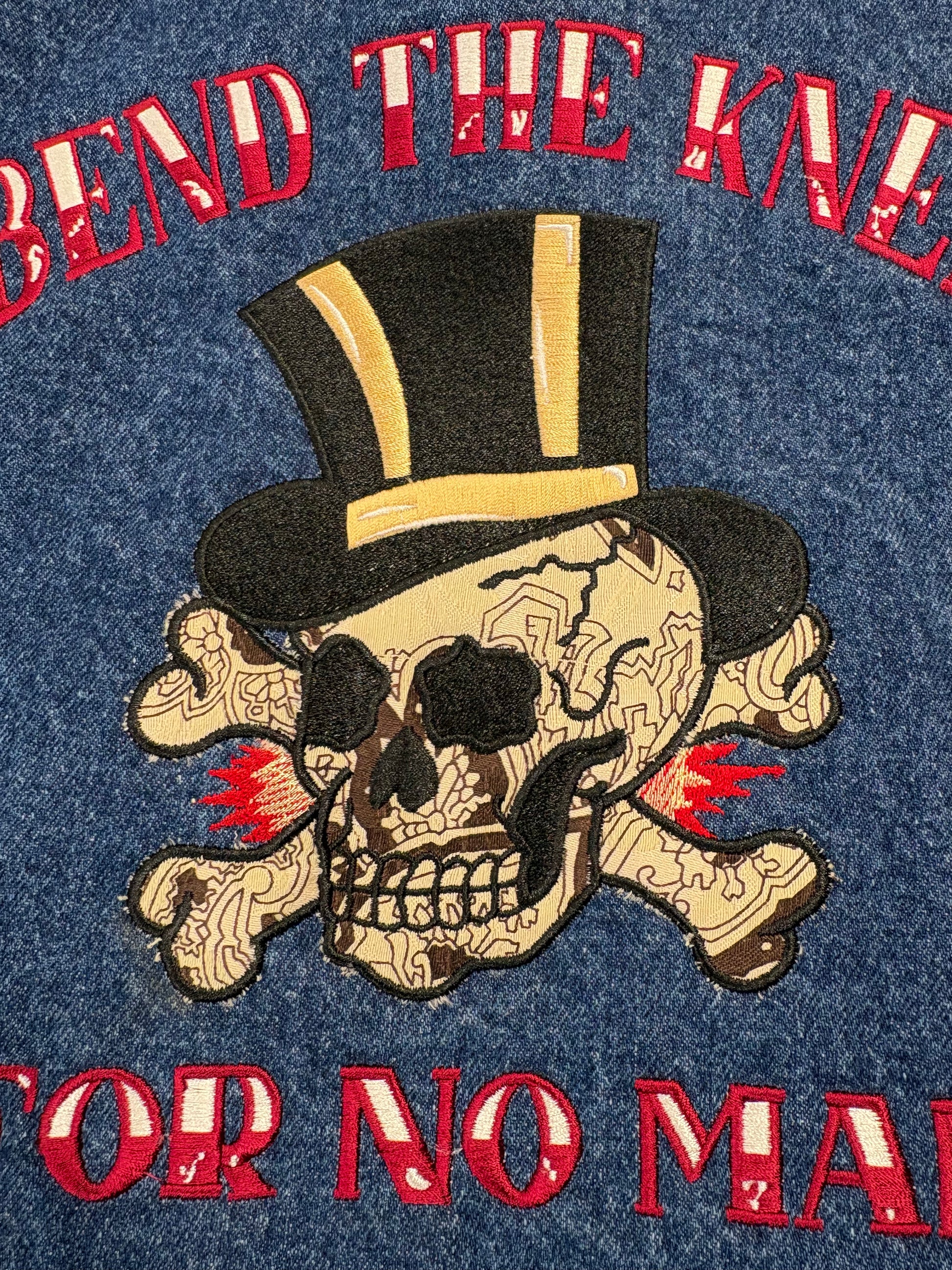 Full back embroidered image "Bend the Knee for No Man" appliqué skull and crossbones.
